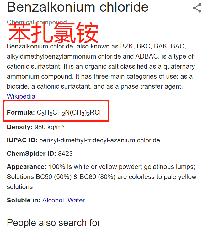 季铵盐第一个就是苯扎氯铵,也叫作n-alkyl-dimethyl benzyl chloride