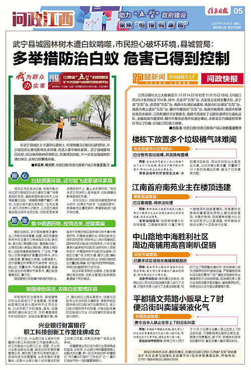 在武宁县城区主干道的行道树上,经常能看见白蚁活动的踪迹,不少居民担心害虫影响生态环境,并进入家中破坏家具。武宁县城管局回应称,经过使用各种药物防治,危害得到控制,下一步会加强绿地的清扫保洁,去除白蚁繁殖环境。